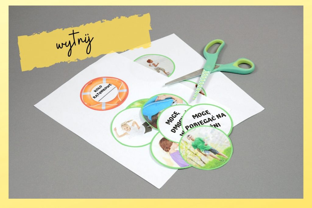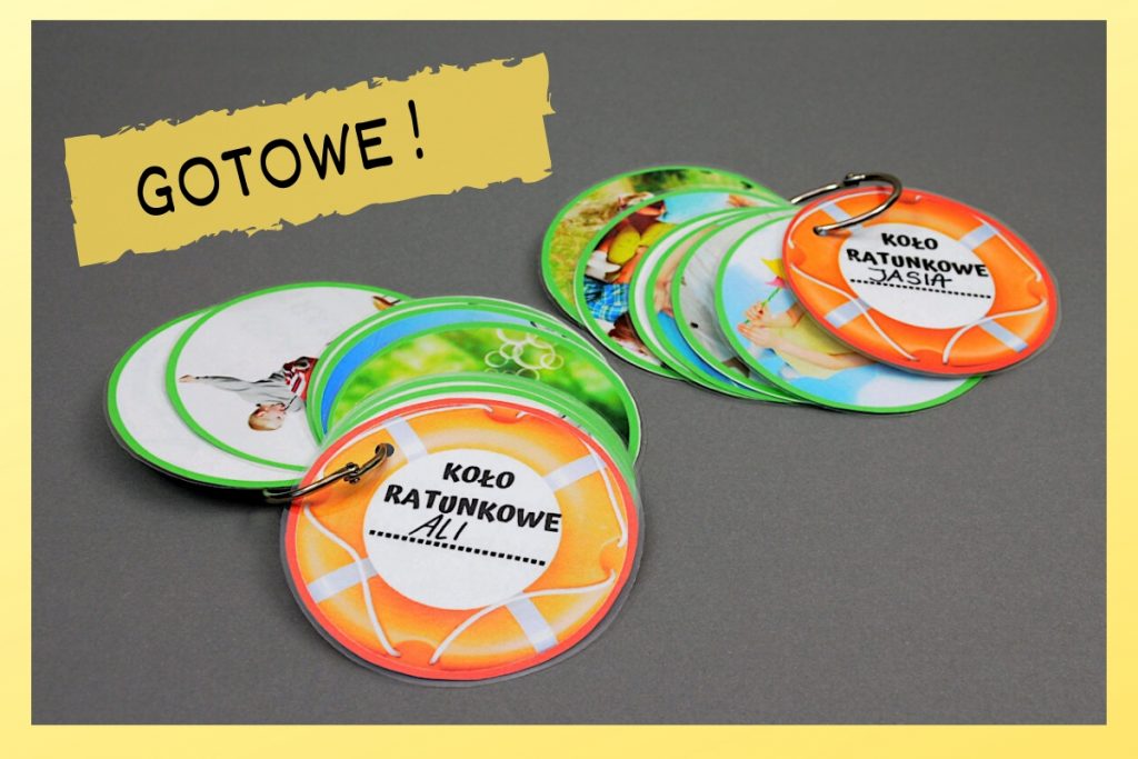 KOŁO RATUNKOWE umieść w dowolnym – łatwo dostępnym dla dziecka miejscu. Może to być wieszaczek obok stolika w pokoju dziecka w domu rodzinnym lub ławki w szkole. Dziecko może również nosić kółeczko z sobą.